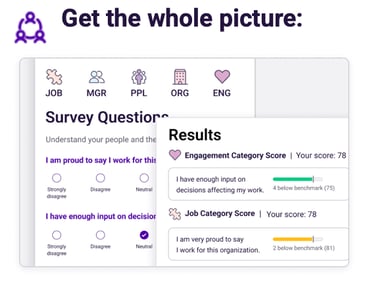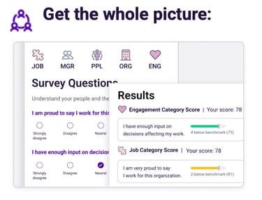 Uncover the true drivers of engagement with anonymous, pre-built surveys. Use the Employee Experience Survey for a comprehensive view of engagement and Pulse Surveys for additional insight in between cycles.